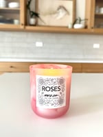 One 12oz coconut blend wax candle with crackling wooden wick poured in pink marbled glass vessel with wood top